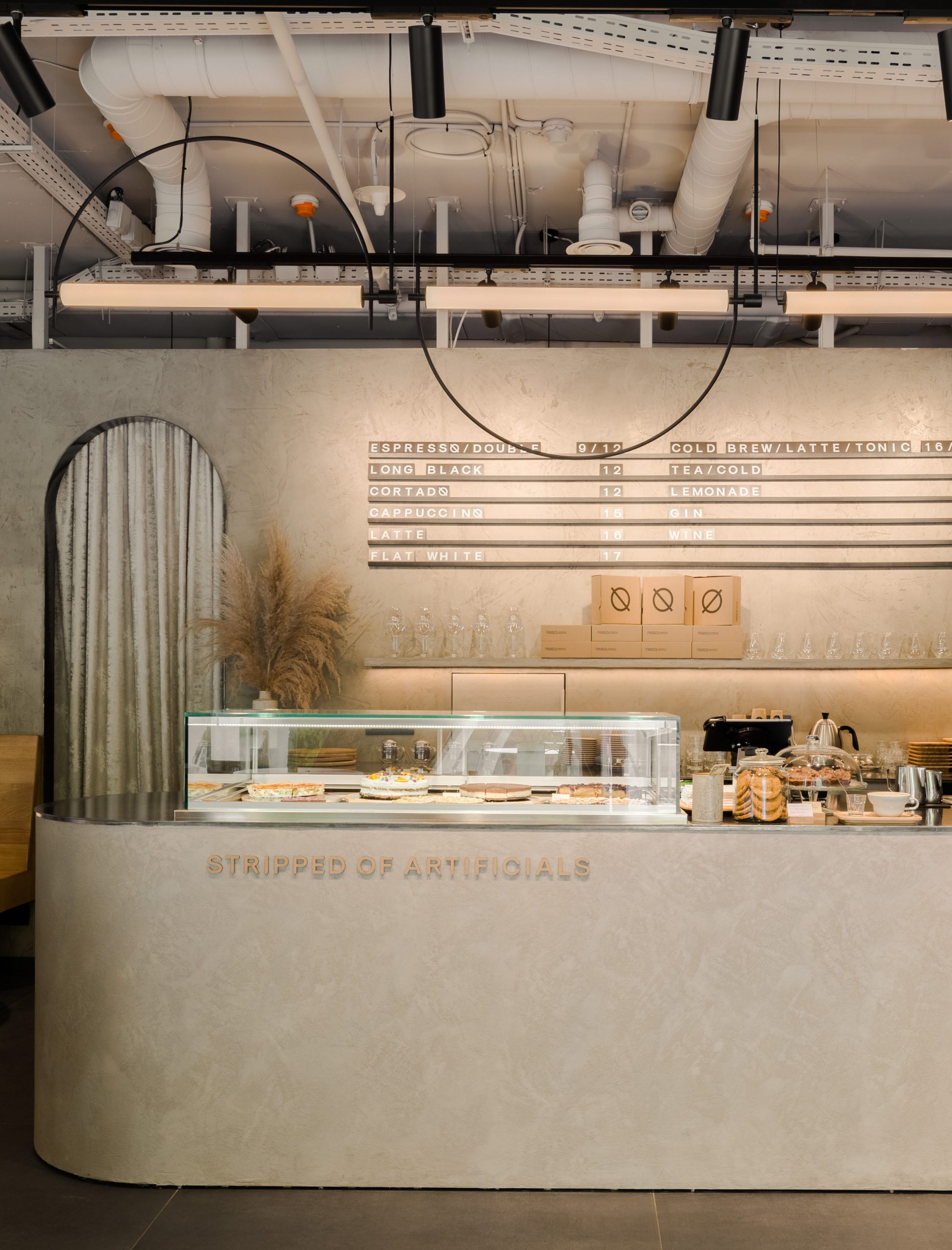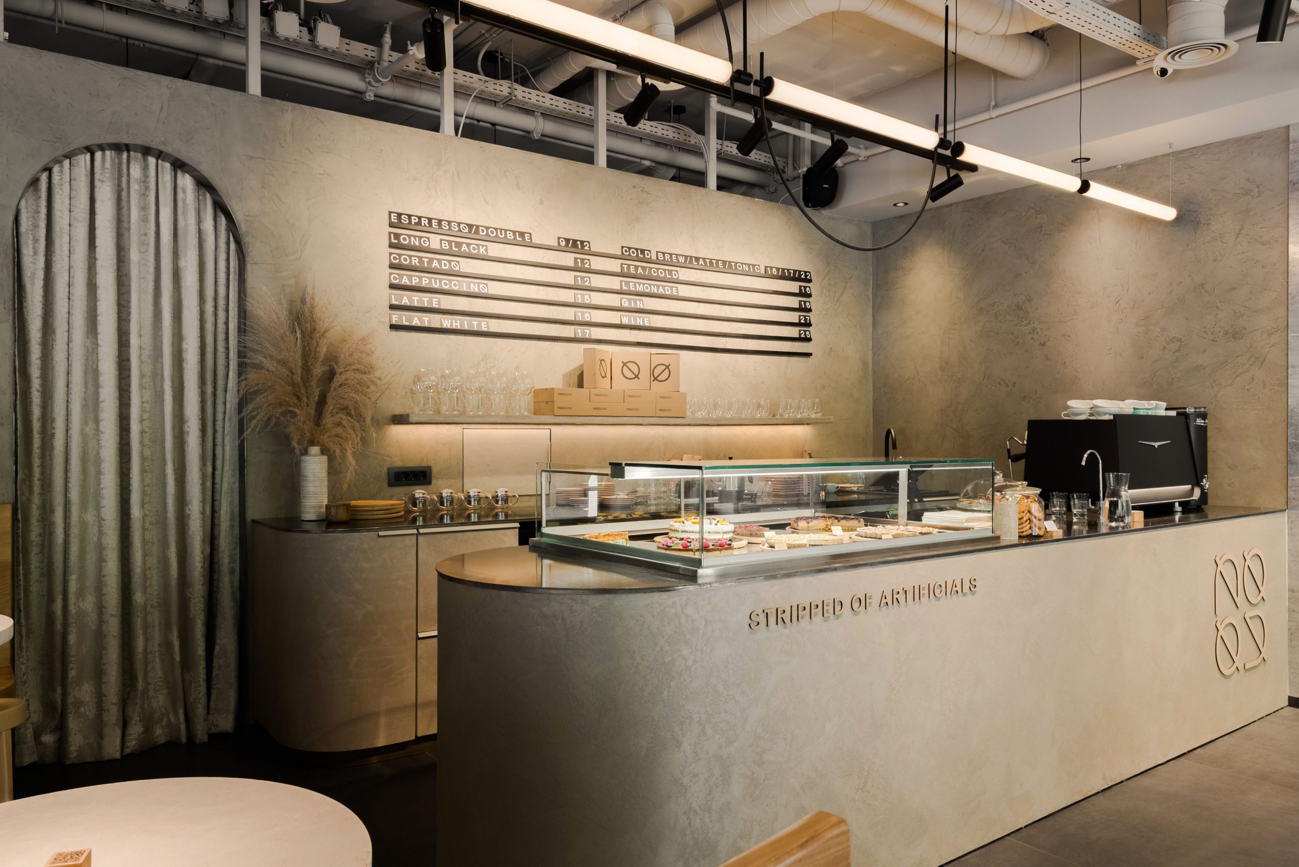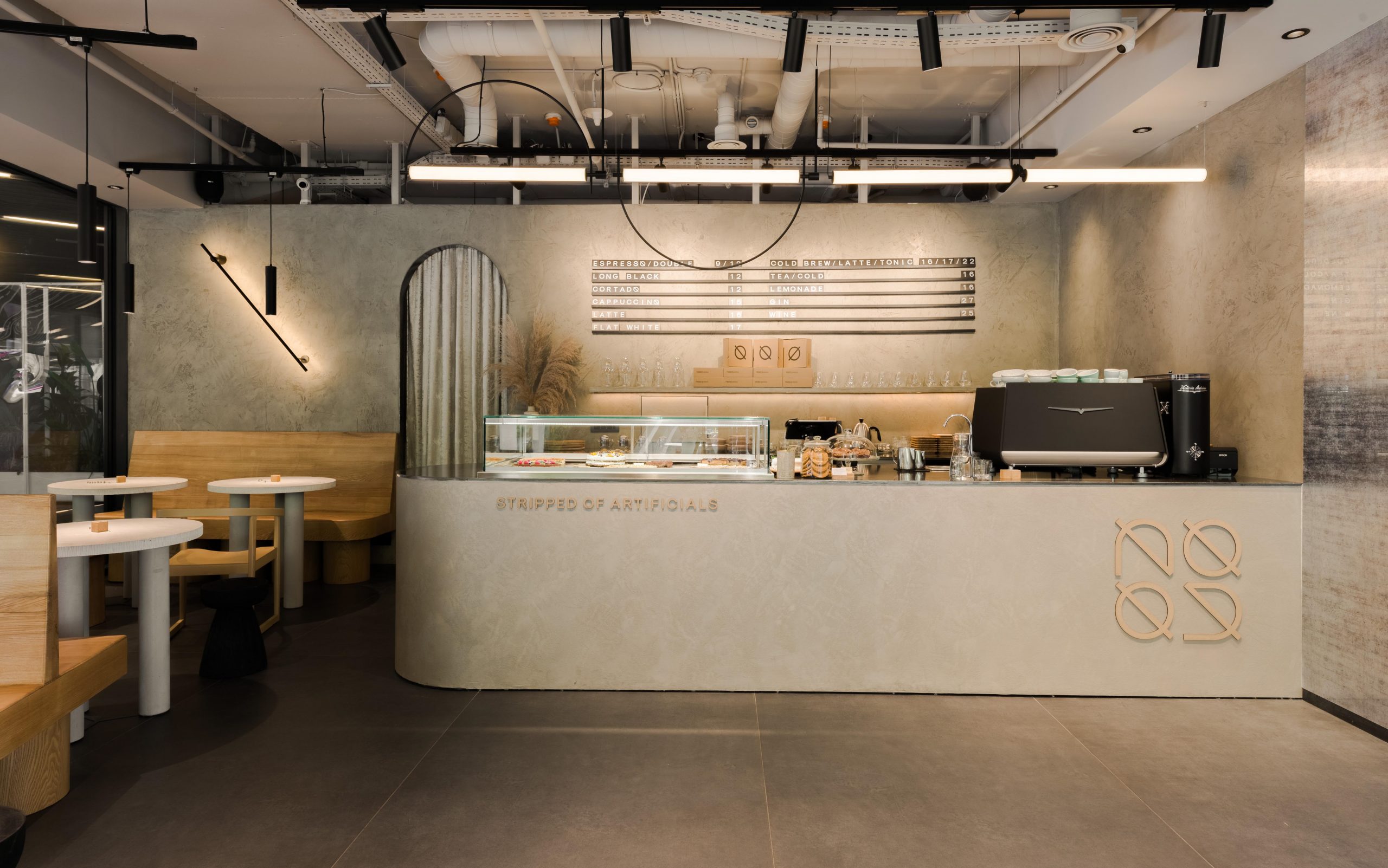 Starting from the logo, color palette, furniture, and materiality, the project reflects the brand’s attitude and promise, shaping a memorable spatial experience defined by the concept “stripped of artificials.” The interior is deliberately eliminates superfluous decorative elements, preserving a monochrome envelope articulated through greige, earthy tones. These are expressed by the raw texture of decorative cement that wraps the walls and the service area (bar and back bar), alongside a porcelain ceramic floor with dark grey, oxidized steel undertones.