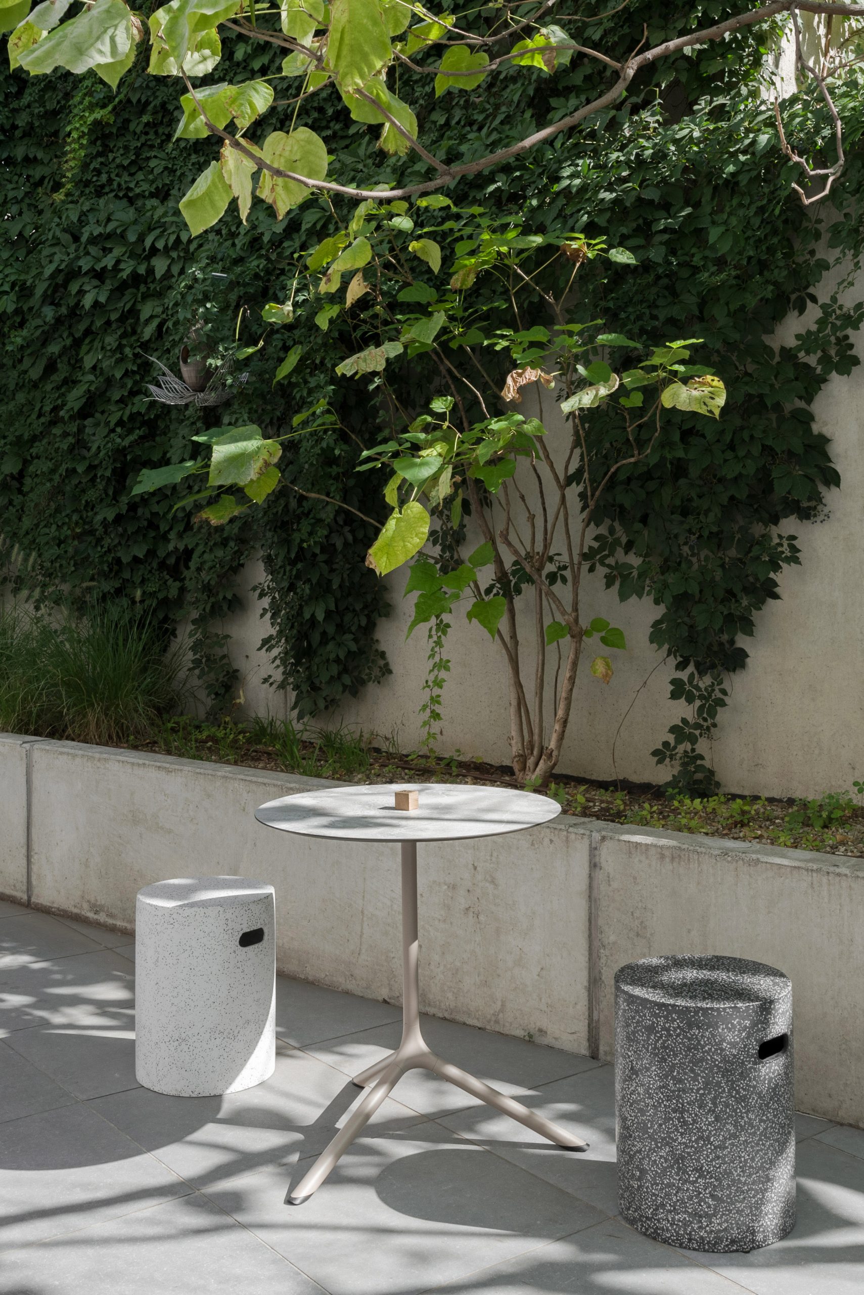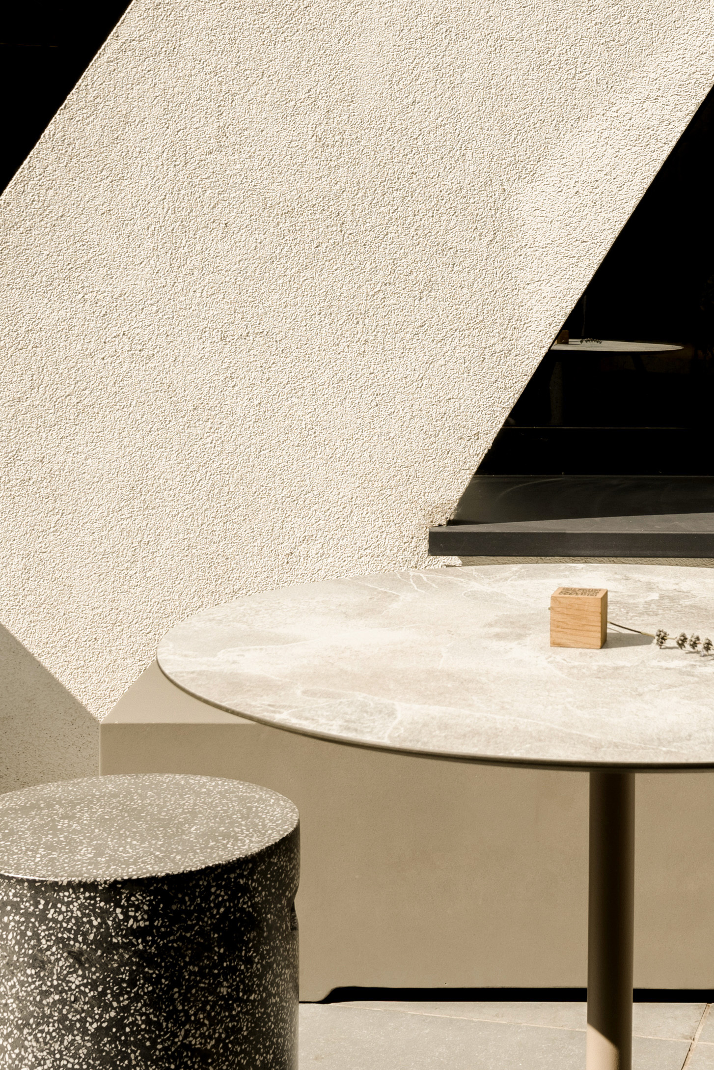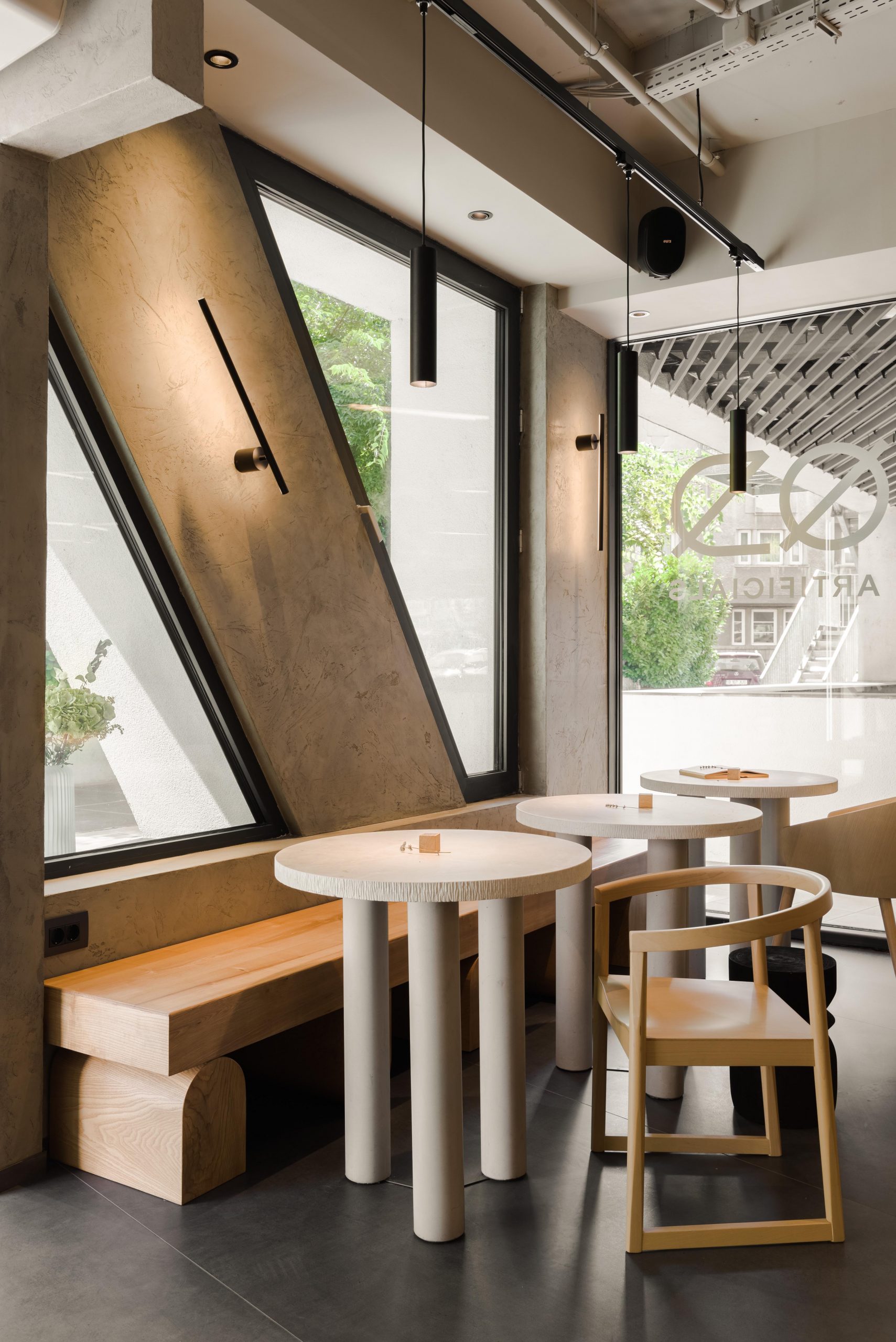 Starting from the logo, color palette, furniture, and materiality, the project reflects the brand’s attitude and promise, shaping a memorable spatial experience defined by the concept “stripped of artificials.” The interior is deliberately eliminates superfluous decorative elements, preserving a monochrome envelope articulated through greige, earthy tones. These are expressed by the raw texture of decorative cement that wraps the walls and the service area (bar and back bar), alongside a porcelain ceramic floor with dark grey, oxidized steel undertones.