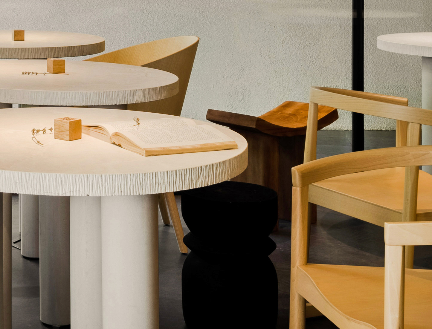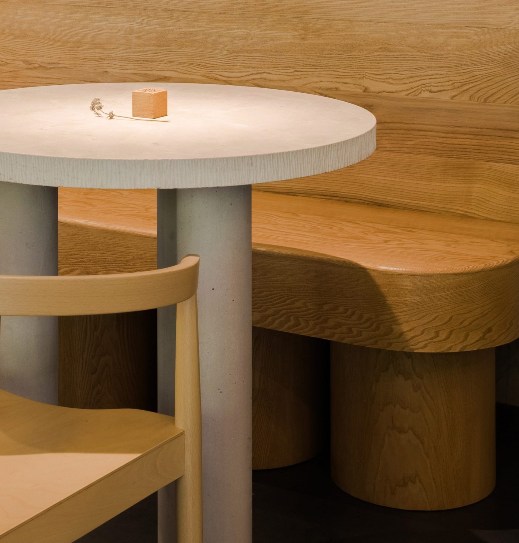 The atmosphere is softened by custom-made ash wood furniture, solid wood chairs and stools, and dimmable lighting system that allows multiple scenographic settings throughout the day.