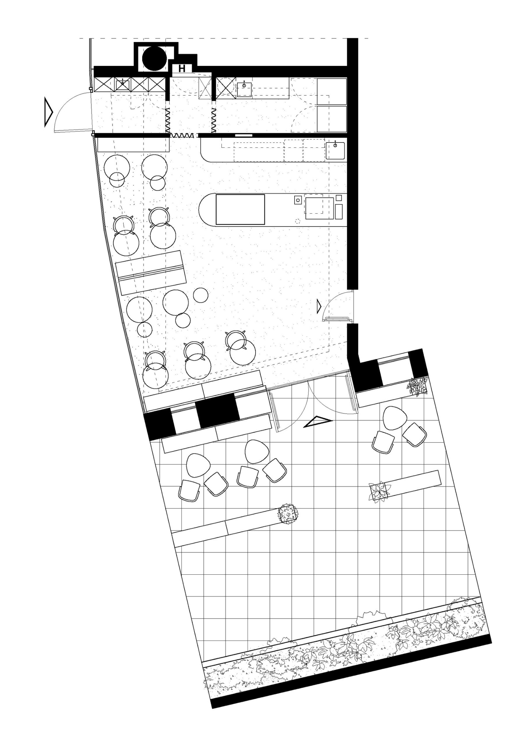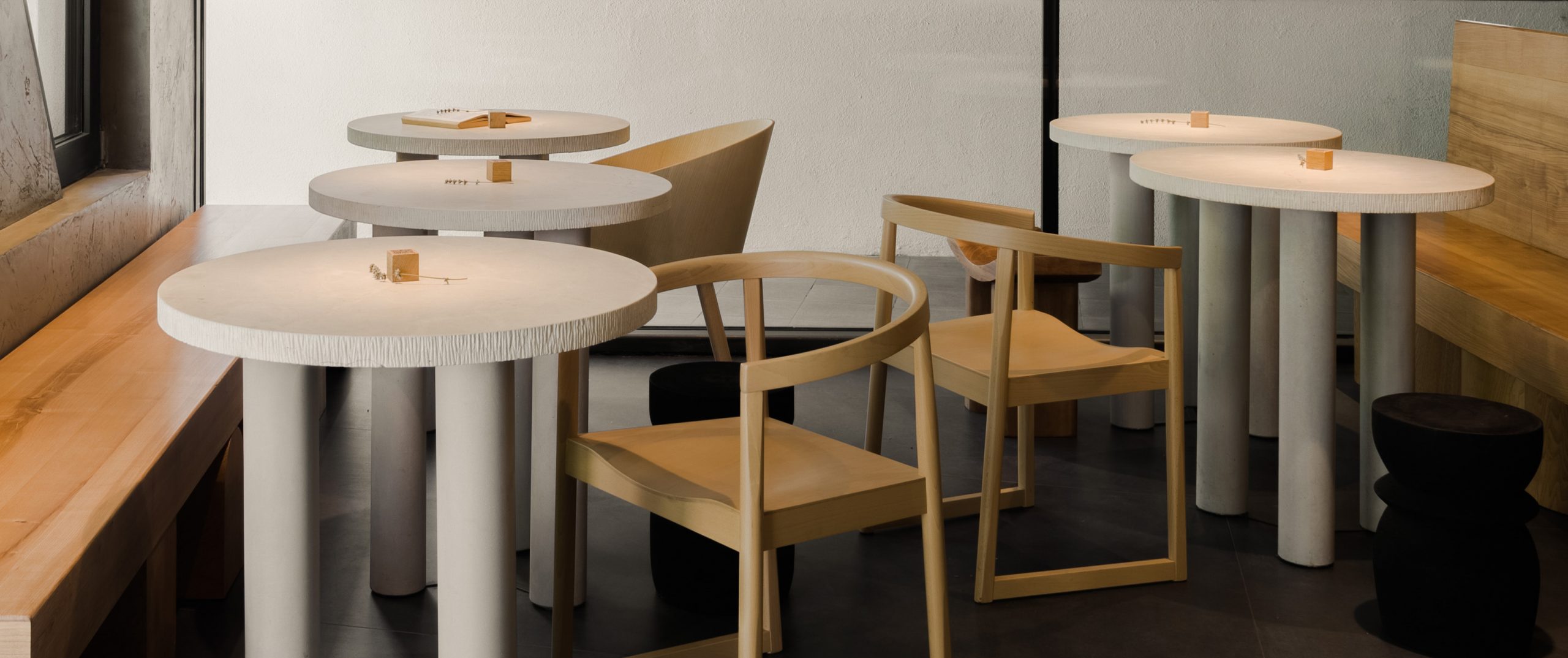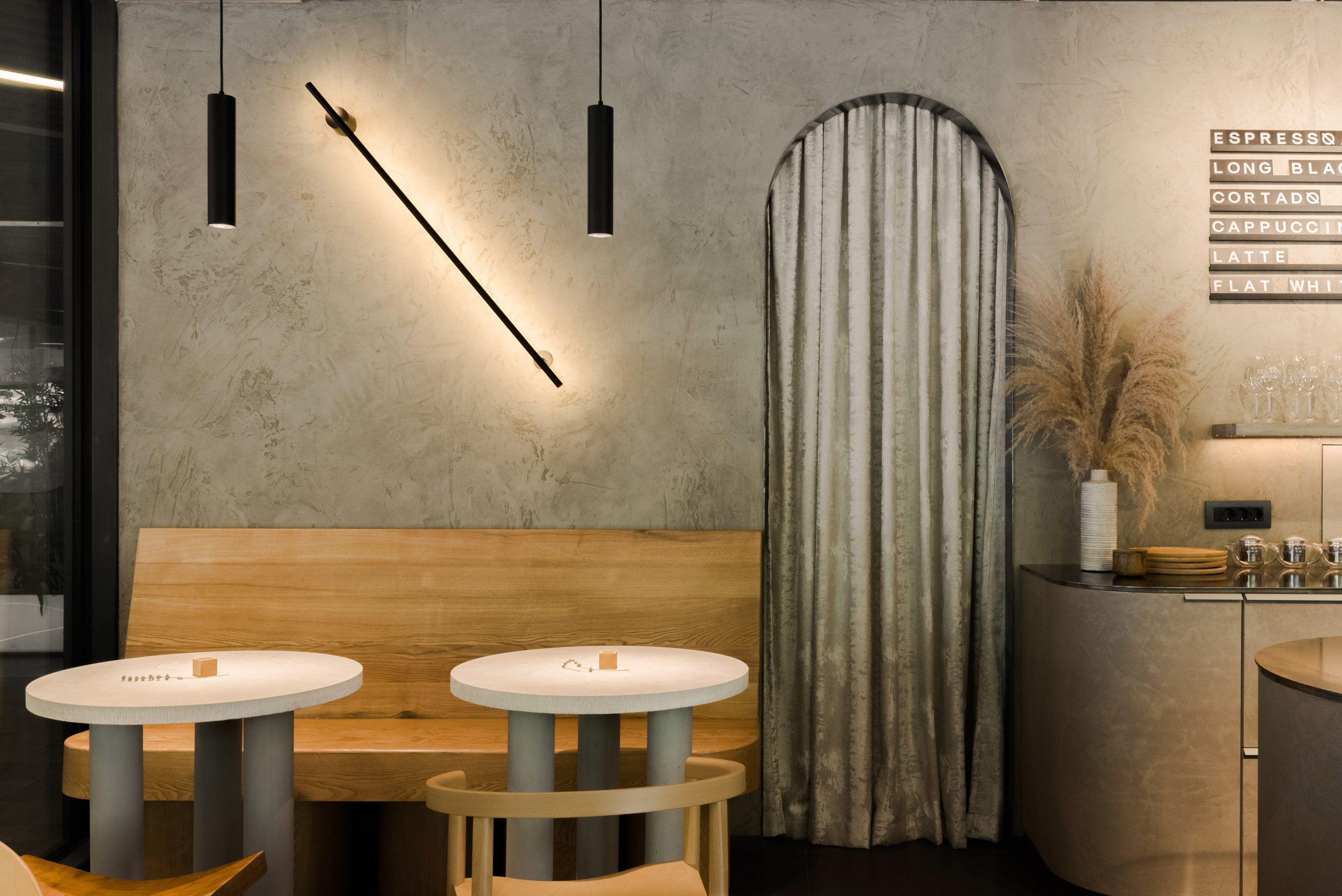 The minimalist language is subtly counterbalanced by an exposed industrial ceiling, with visible installations painted entirely in cement grey to unify the complexity of the overhead plane. The Roman arch emerges as a recurring motif throughout the space, informing the rounded geometry of the bar and back bar, the logo lettering applied to the bar front, the transitional opening between the public area and the staff zone, as well as the curved backs of the oak chairs and the centipede-like legs of the oiled ash benches.
