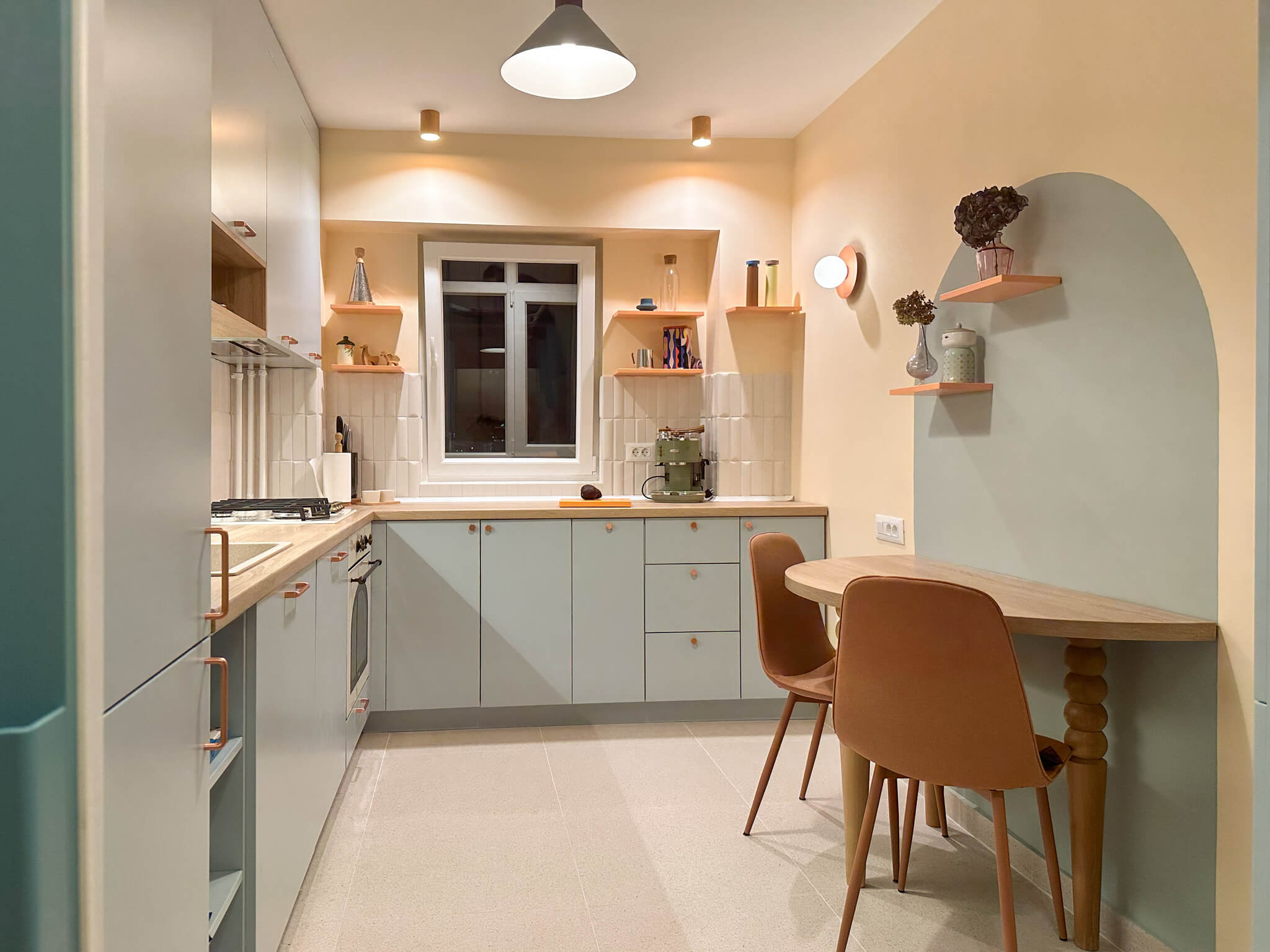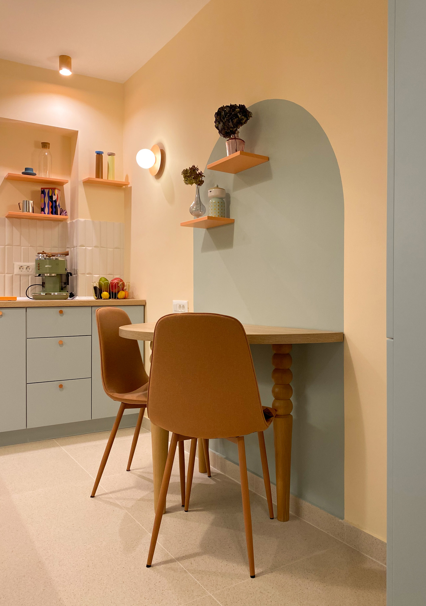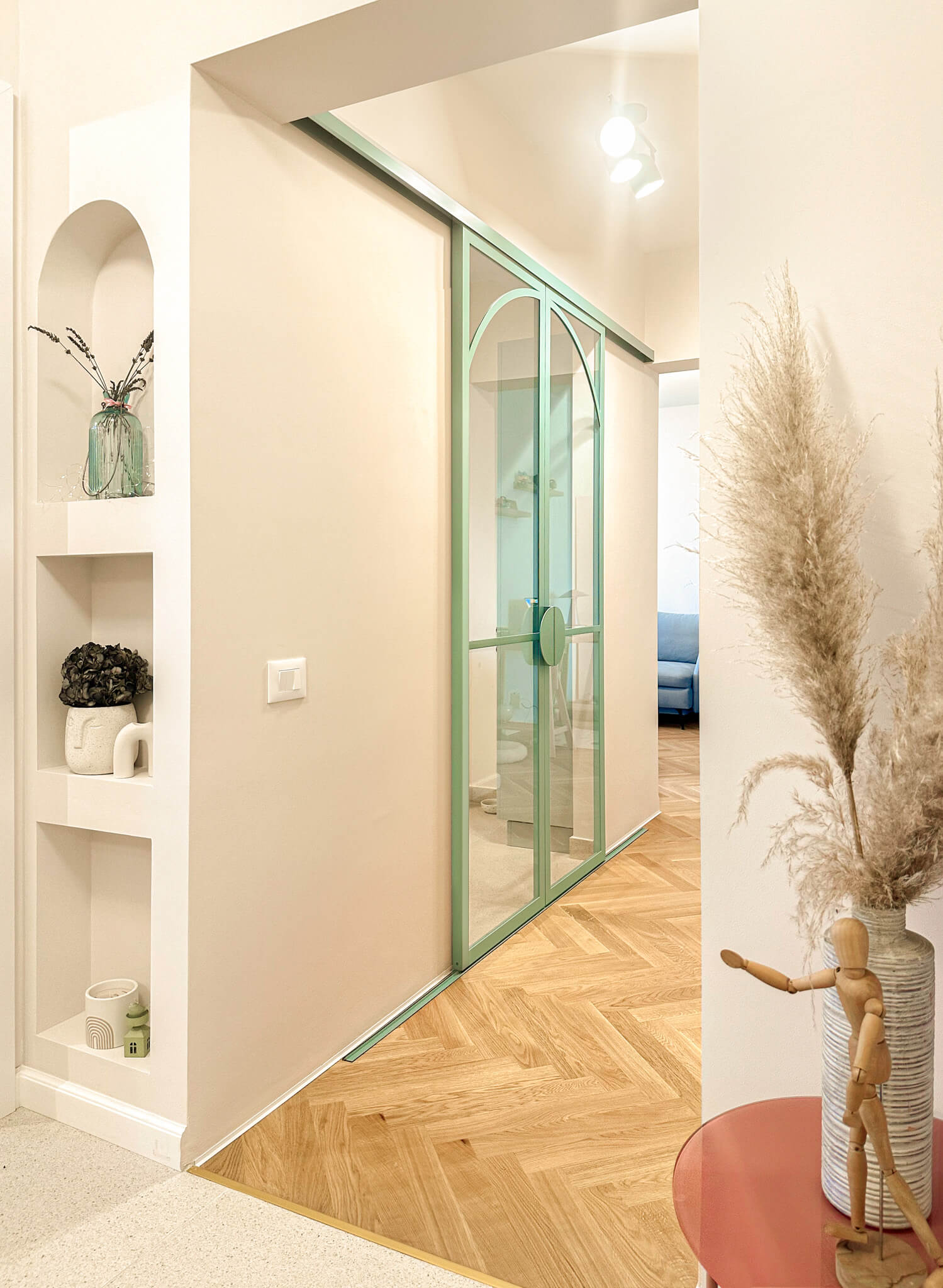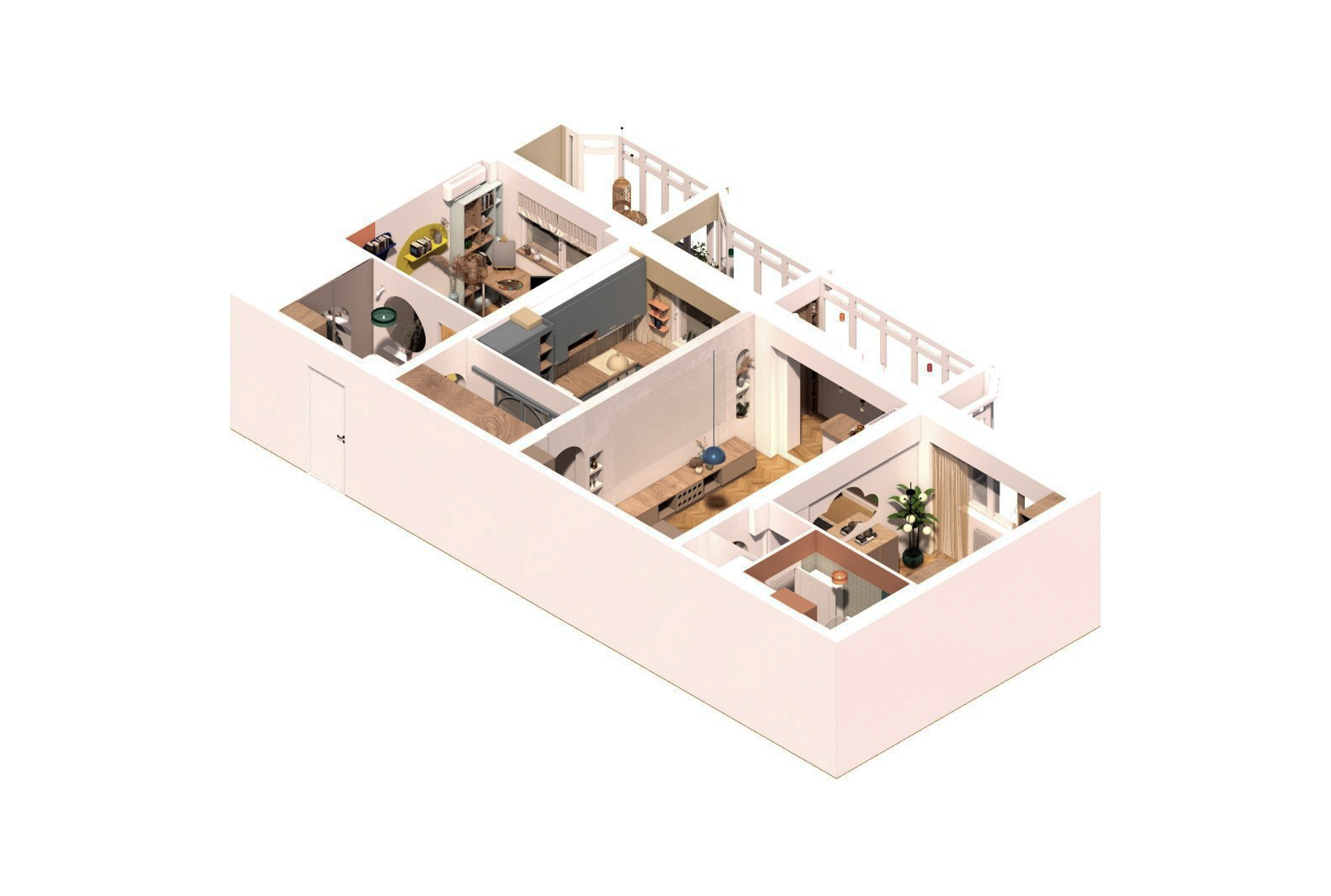 The design brief for the apartment entitled Pastel was shaped by the clients’ lifestyle, habits, and personal interests. Although both have corporate backgrounds, they currently work as freelancers, with a large part of their professional activity taking place at home. The project therefore addresses a hybrid way of living, where structured work tasks and more informal, creative activities share the same spaces as everyday domestic life.