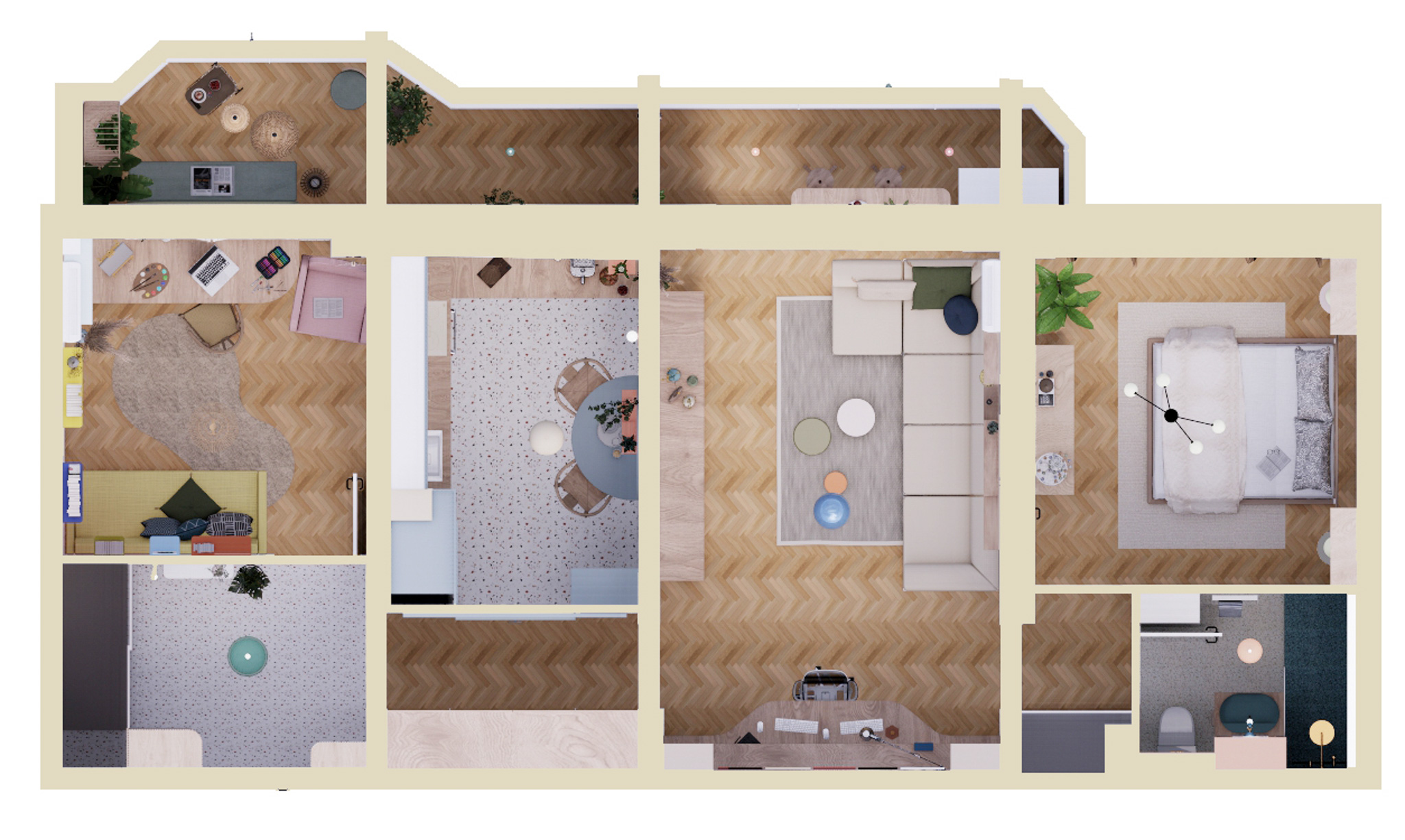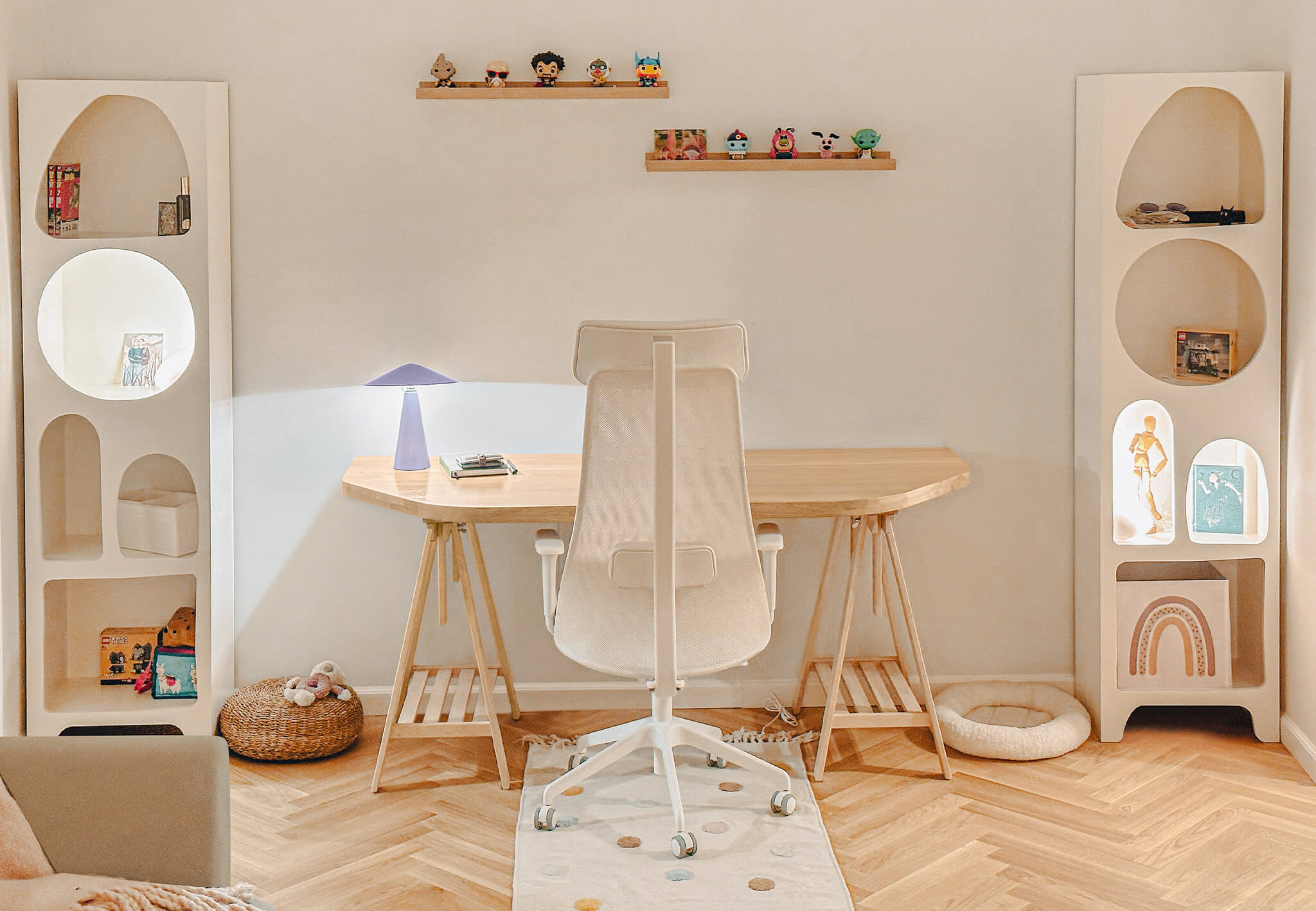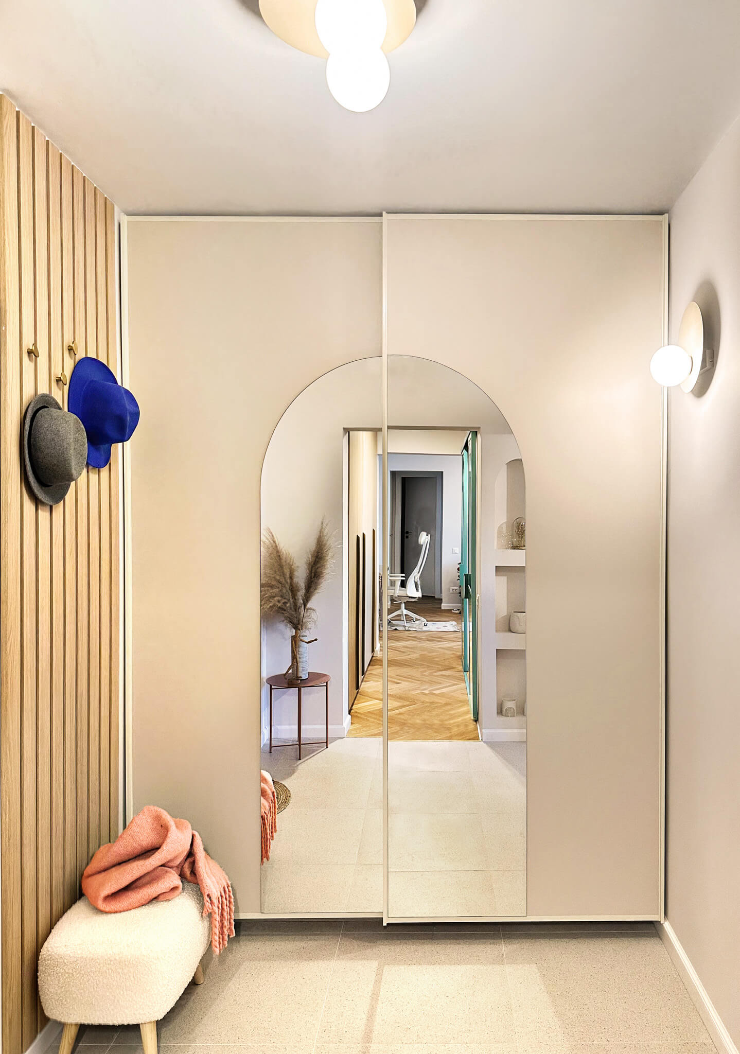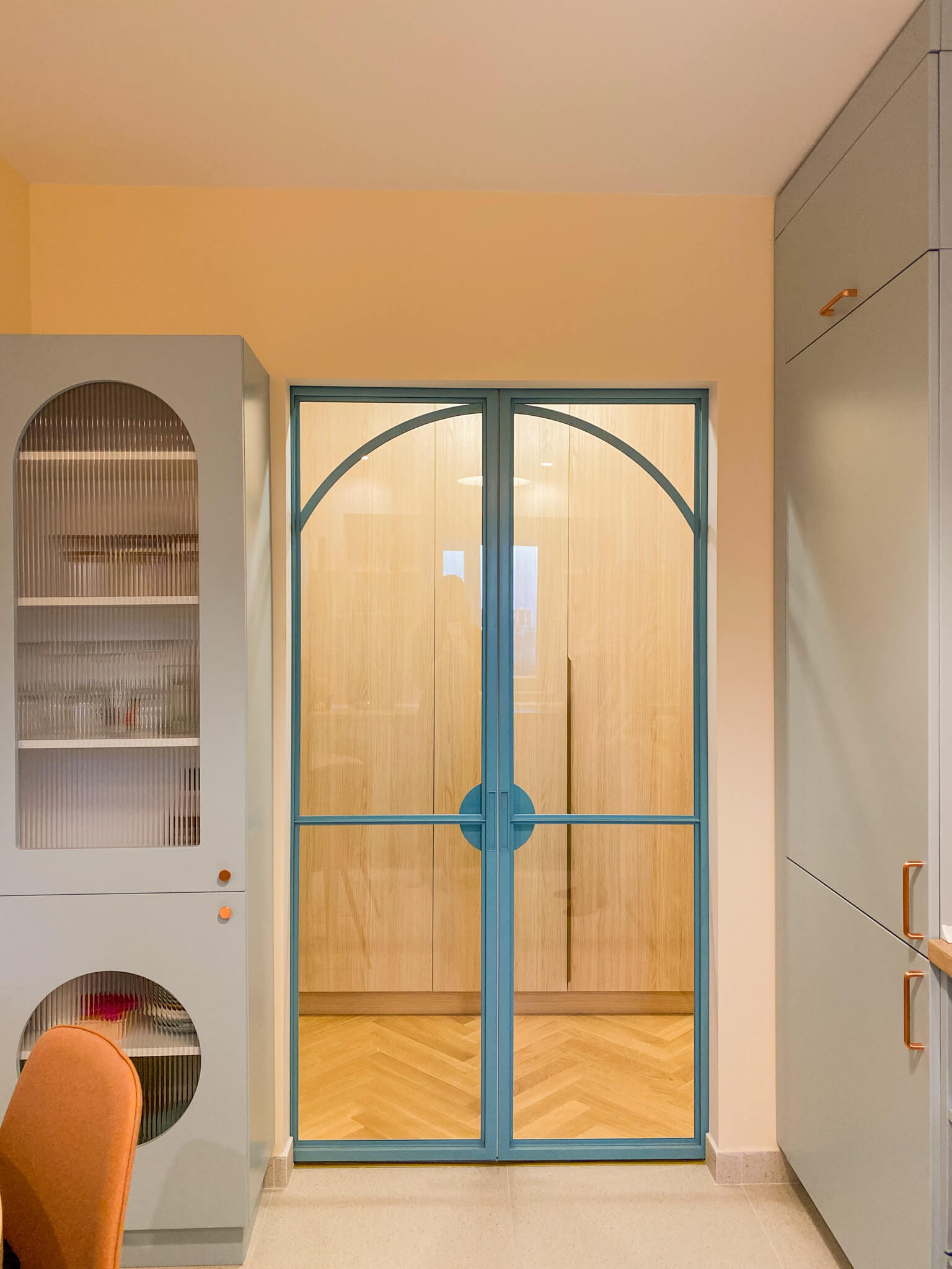 The design brief for the apartment entitled Pastel was shaped by the clients’ lifestyle, habits, and personal interests. Although both have corporate backgrounds, they currently work as freelancers, with a large part of their professional activity taking place at home. The project therefore addresses a hybrid way of living, where structured work tasks and more informal, creative activities share the same spaces as everyday domestic life.