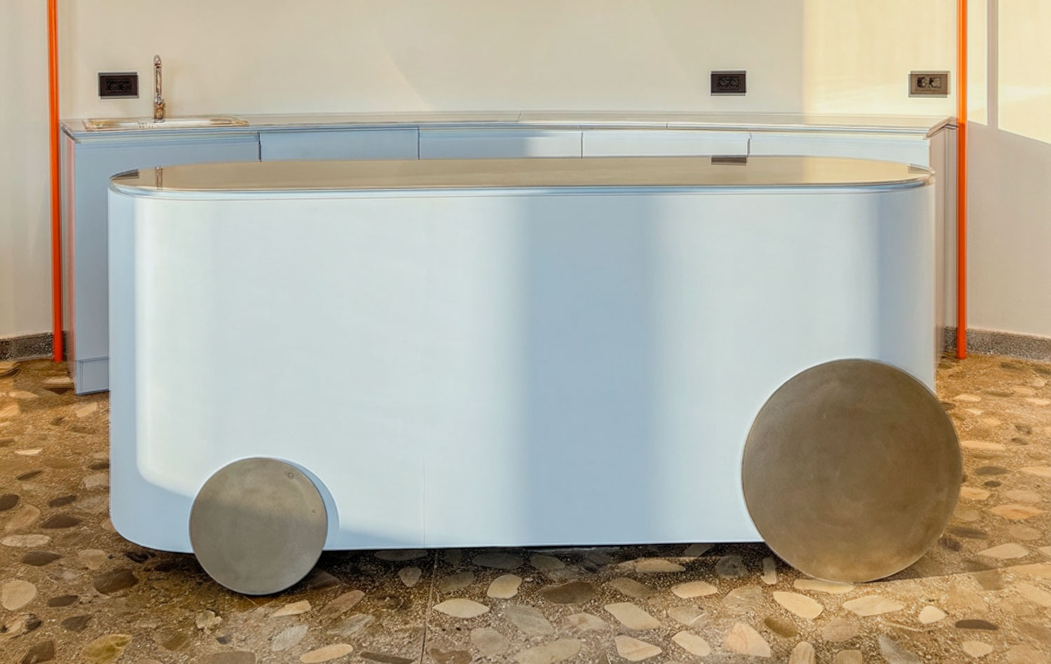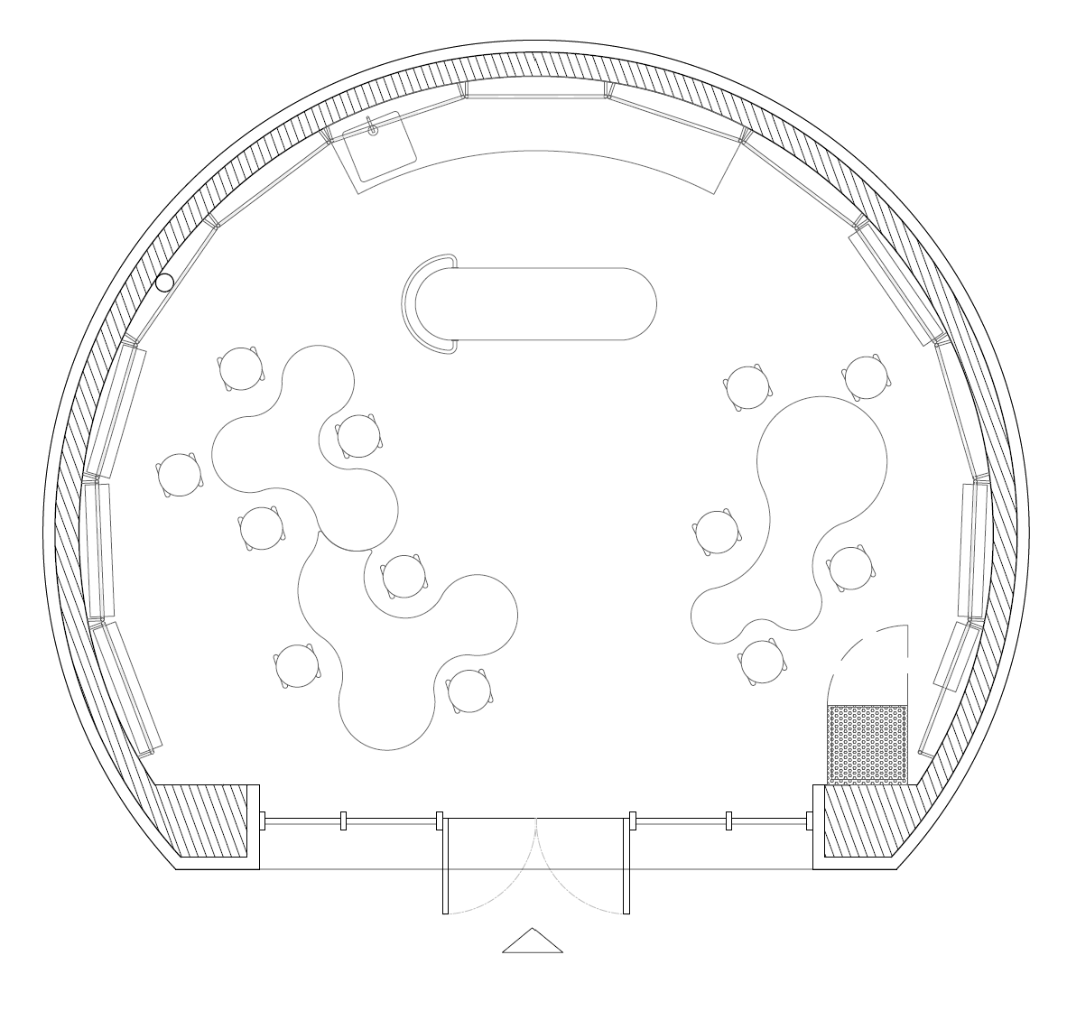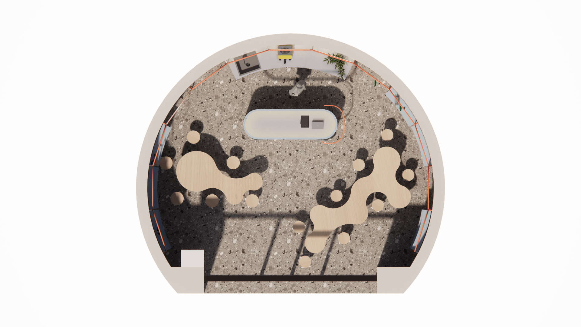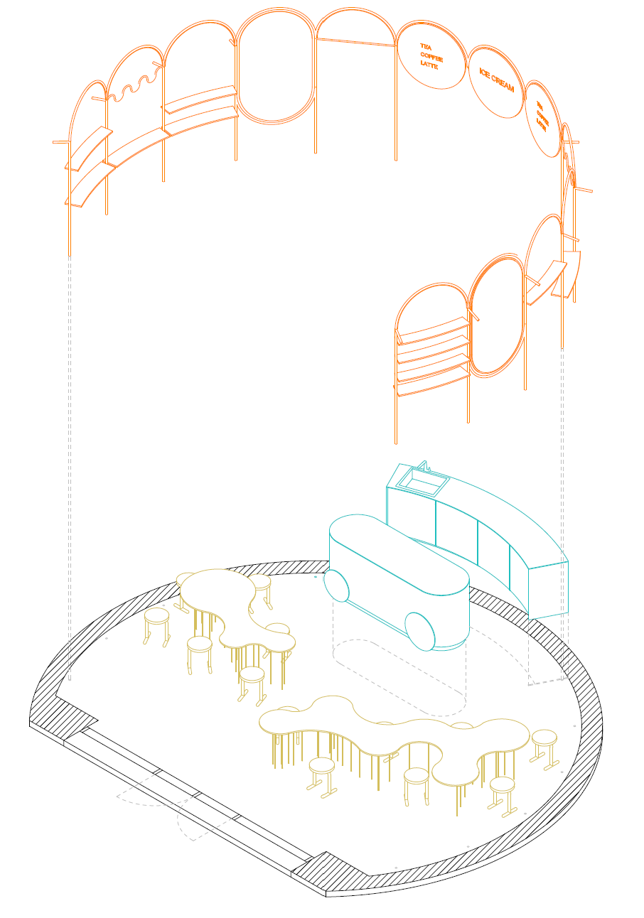 The bar and back bar, finished in soft shades of blue, visually enclose the space, acting as a central focal point while maintaining a gentle, approachable presence. Their rounded forms echo the roundness of the plan, contributing to a coherent spatial flow.