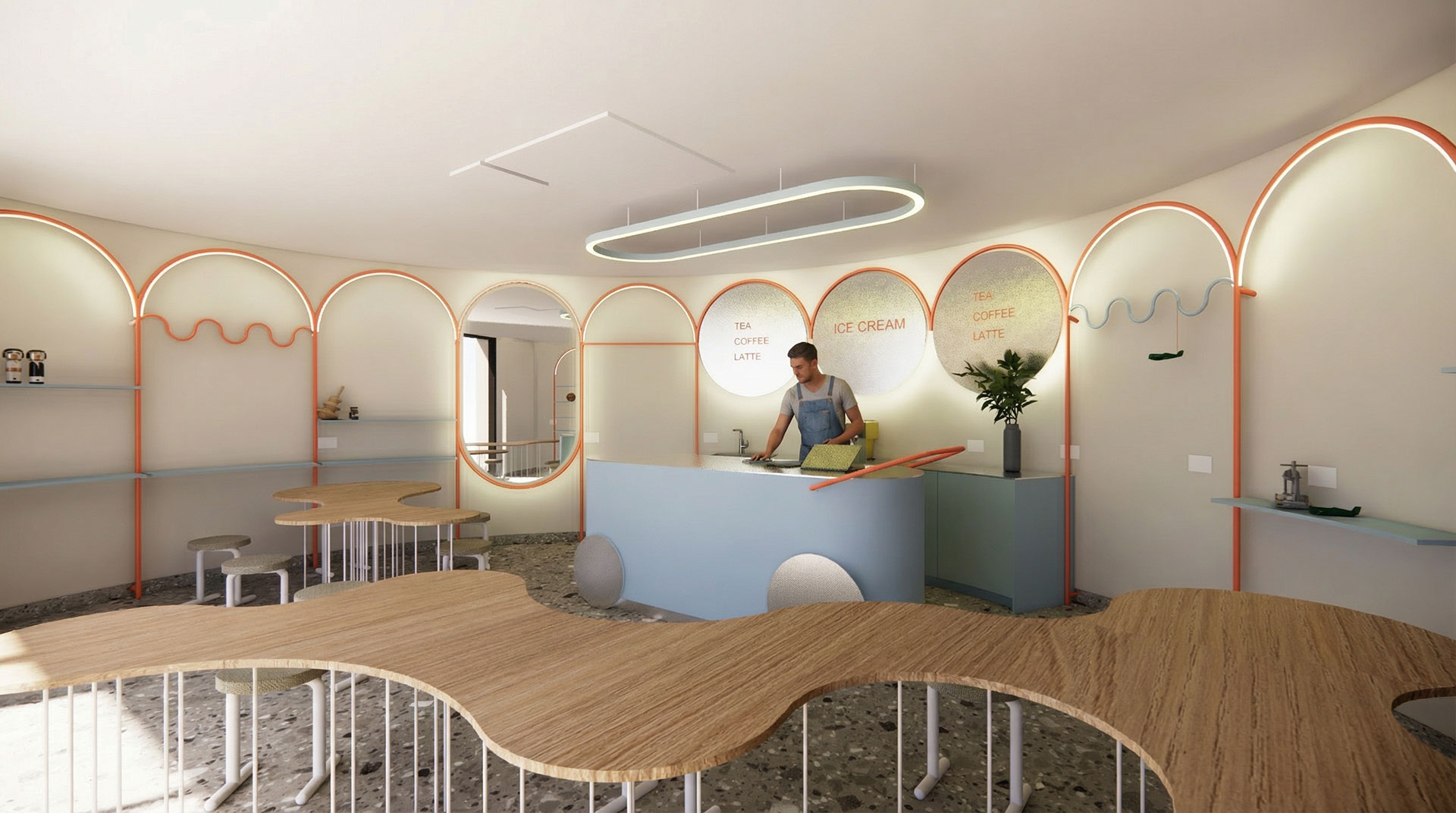 The project proposes the interior design of a children’s cafe, conceived as a playful, welcoming space that stimulates curiosity, movement, and interaction. The existing curved floor plan already suggests a sense of playfulness and fluidity, becoming the starting point for a spatial concept rooted in softness, rhythm, and exploration.