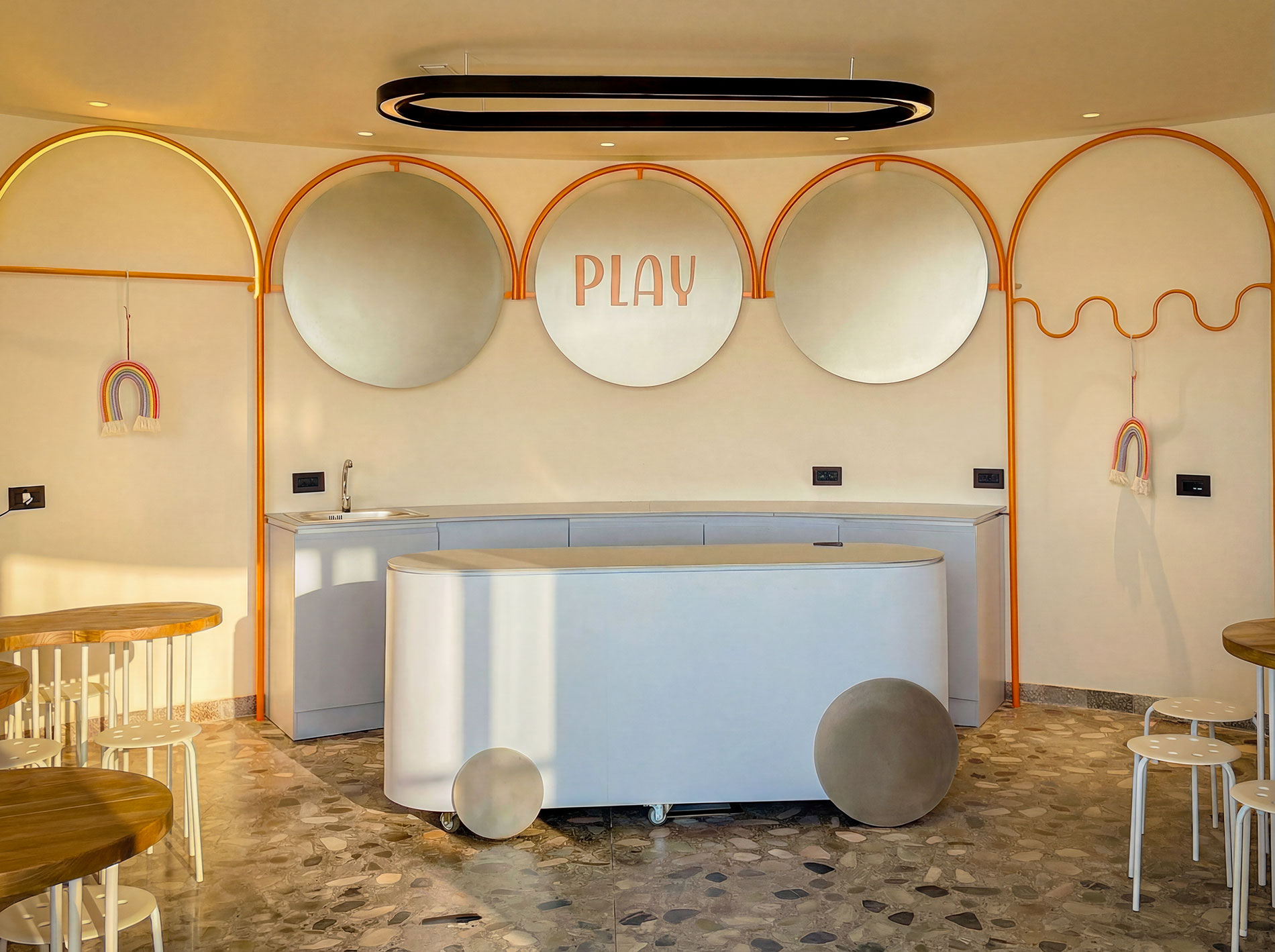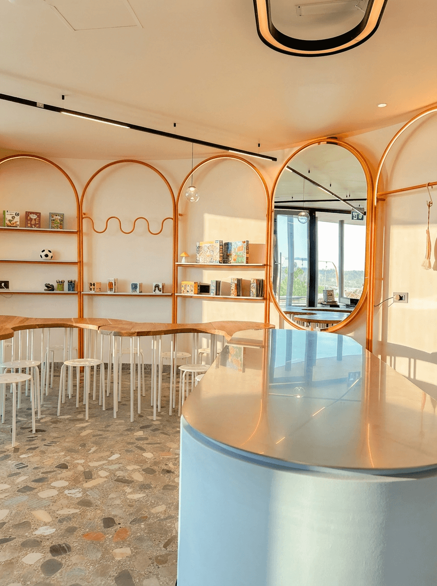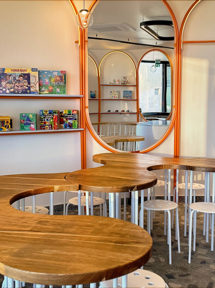 At the heart of the cafe, two custom-designed tables are shaped by open and closed curved geometries, encouraging playful circulation and spontaneous interaction. Their organic shapes invite children to move around, explore, and engage with the space intuitively.