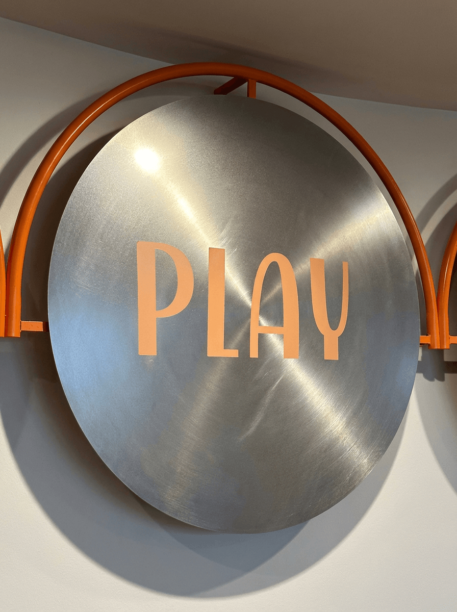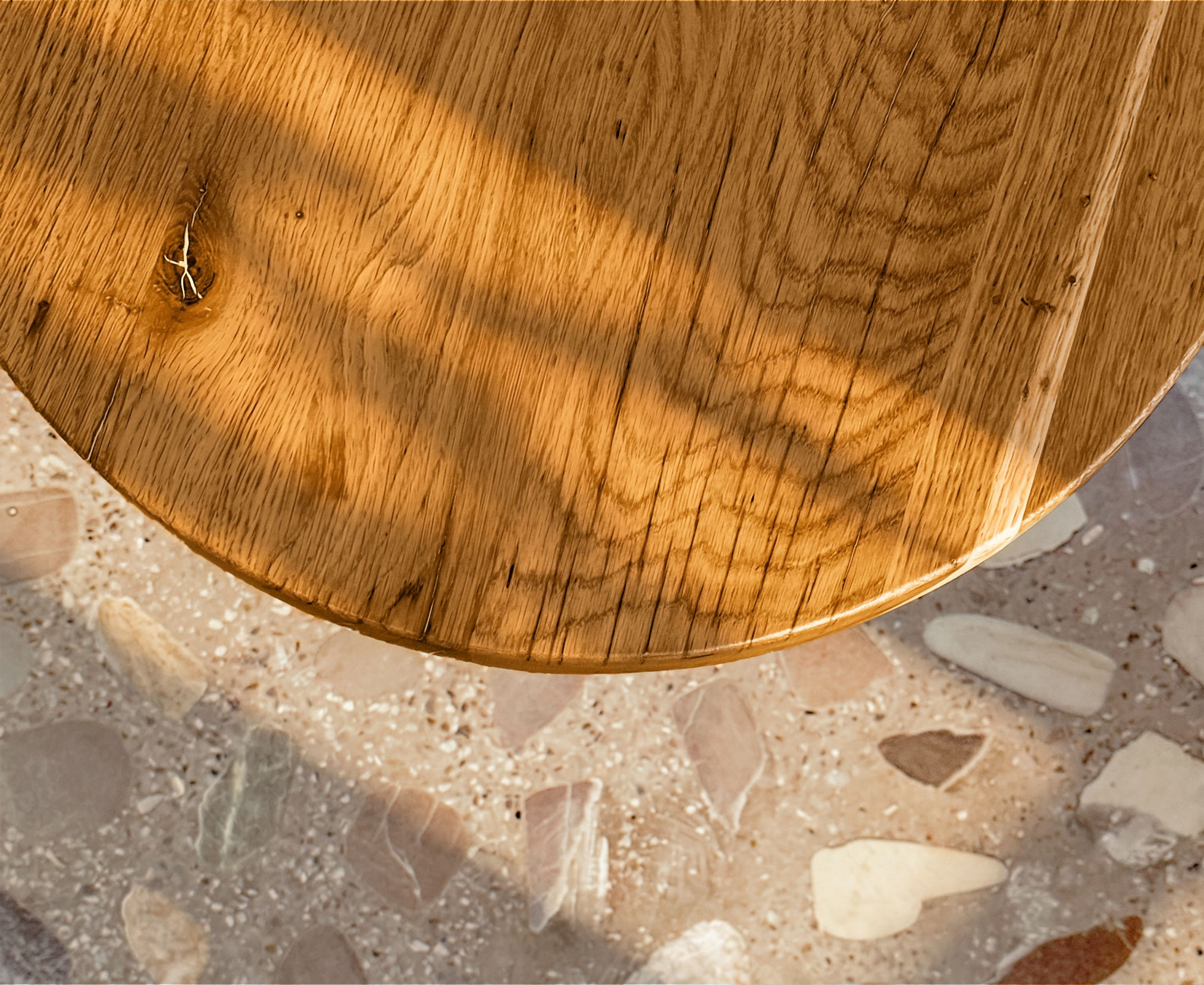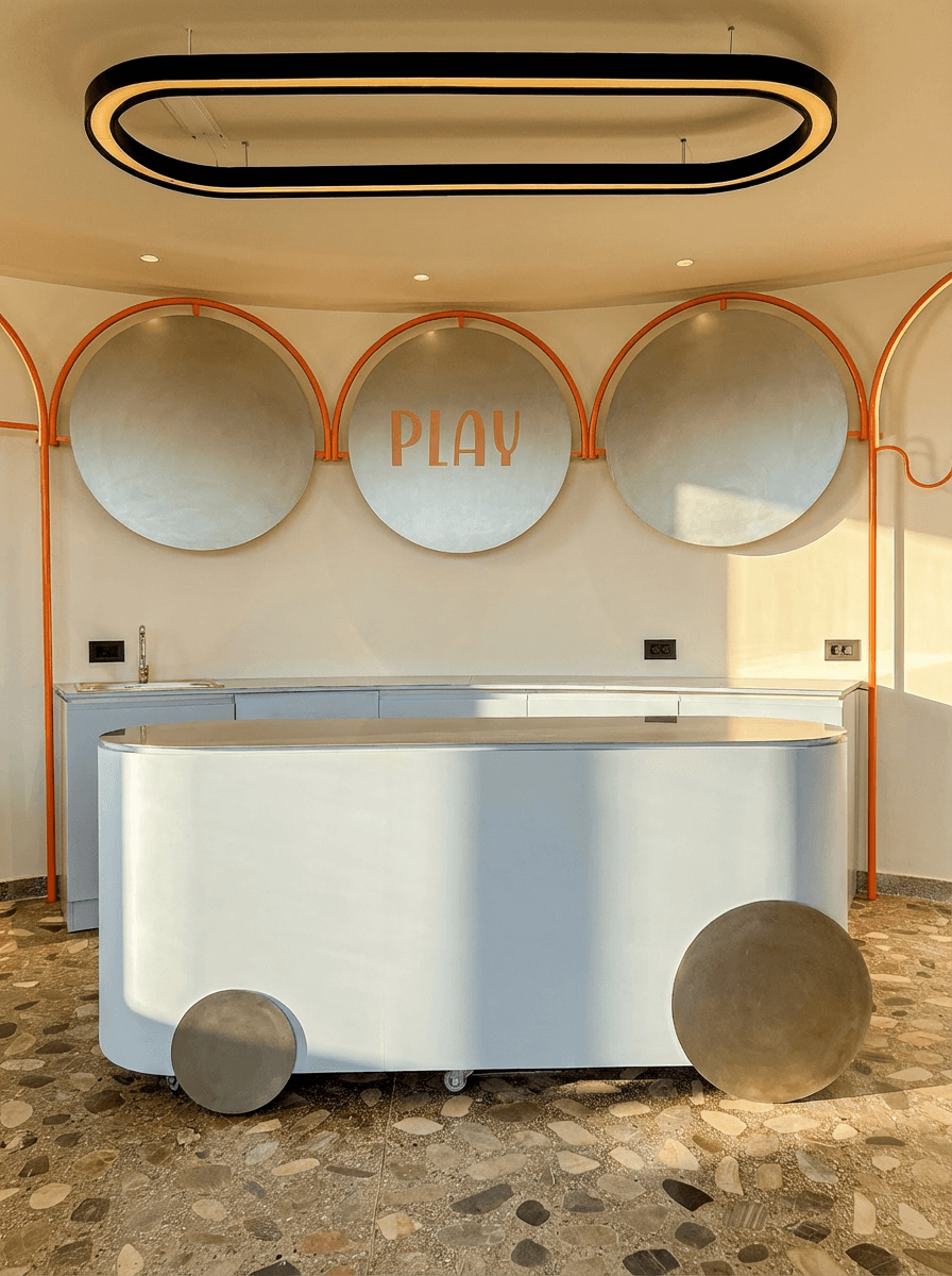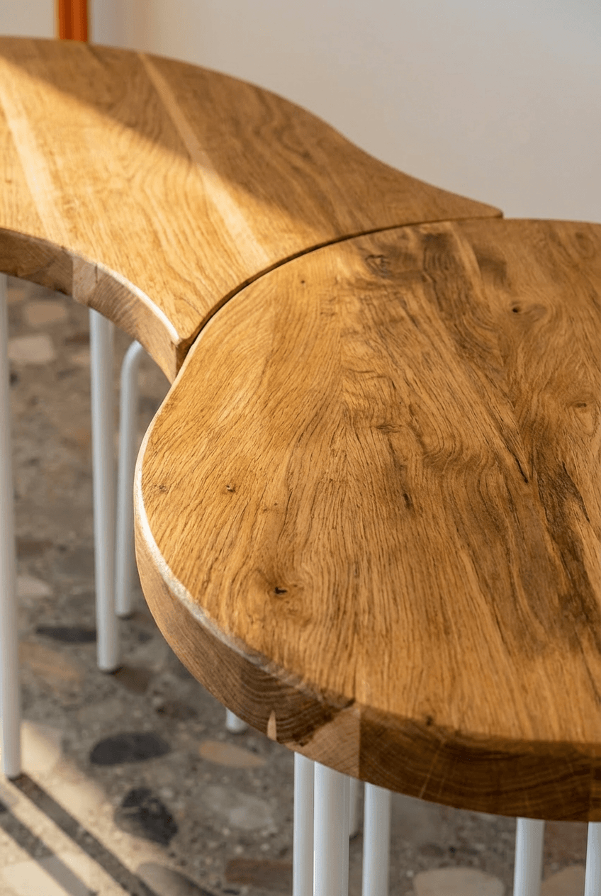 At the heart of the cafe, two custom-designed tables are shaped by open and closed curved geometries, encouraging playful circulation and spontaneous interaction. Their organic shapes invite children to move around, explore, and engage with the space intuitively.
